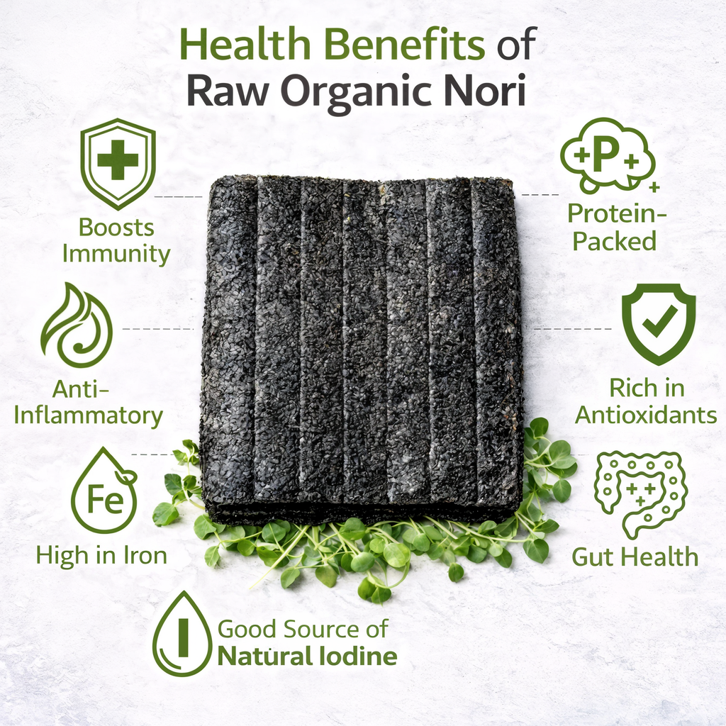 - Nori is found to contain anti-oxidant compounds such as Chlorophyll and Phycoerythrin, and is a great source of Polysaccharides, which help modulate immune response. It also has beneficial effects on gut function and micro biota, acting as a Prebiotic.